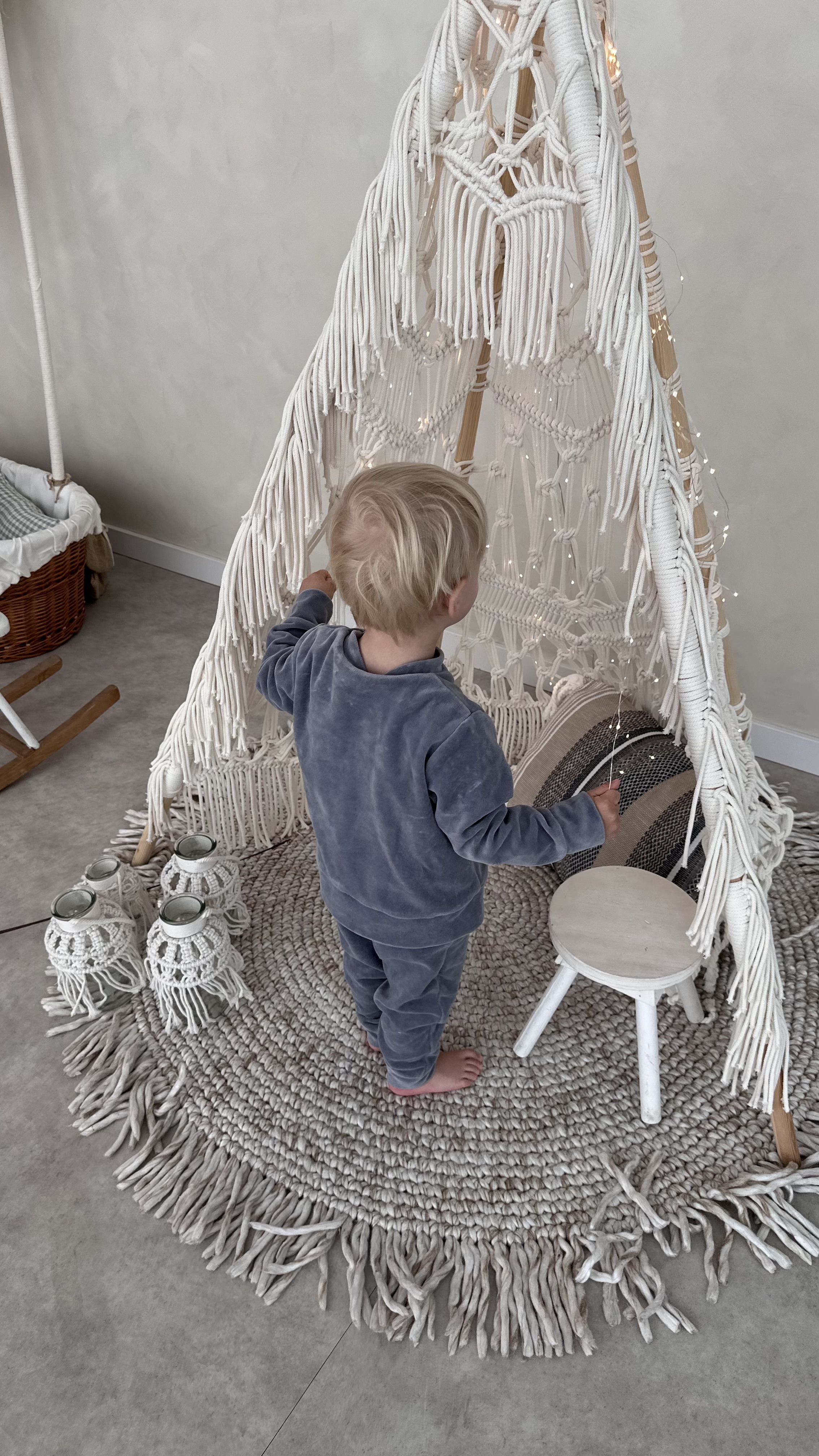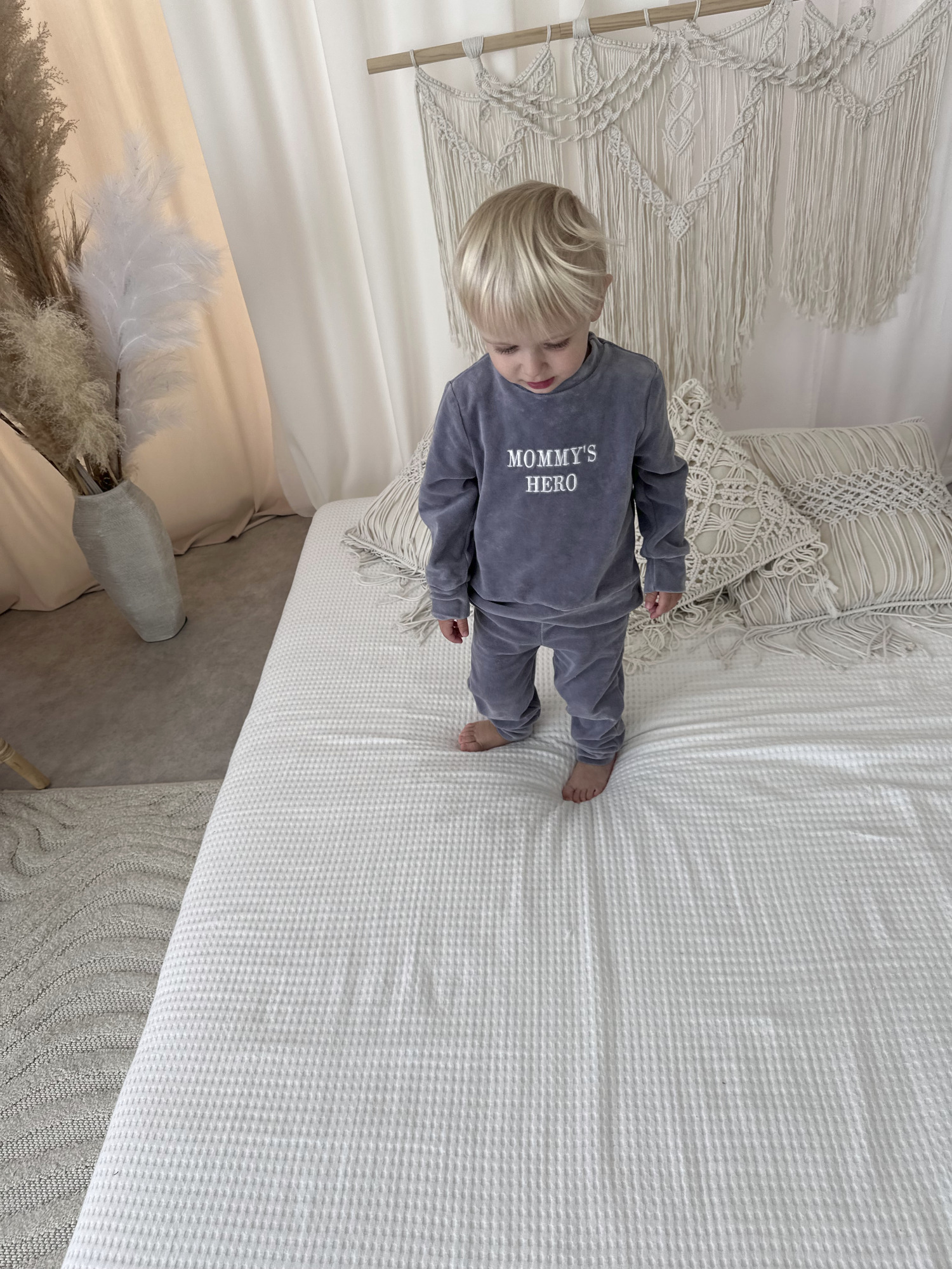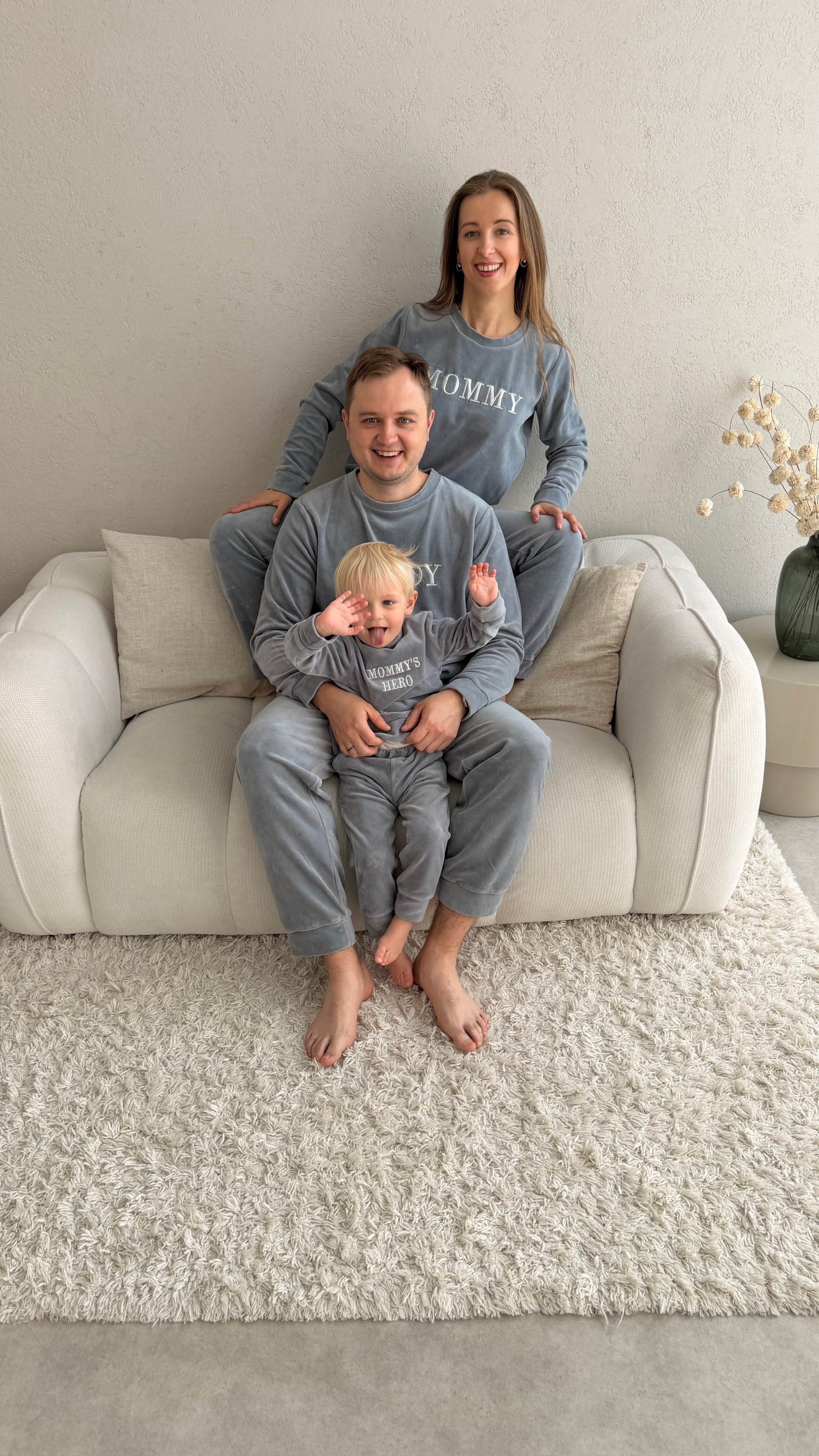 Dziecięcy dres musi być wygodny, ale też wytrzymały. Ten szyjemy z miękkiego weluru bawełnianego, który jest przyjemny dla skóry i dobrze znosi codzienne noszenie.