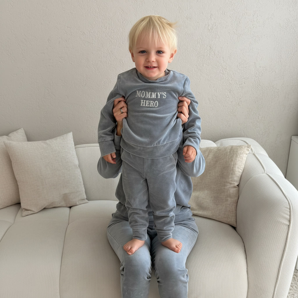 Dziecięcy dres welurowy z personalizowanym haftem na bluzie. Jest miękki, wygodny i uszyty z polskiego weluru z certyfikatem Oeko-Tex. Bluza ma ściągacze, spodnie są na gumce, a szerokie ściągacze przy nogawkach pomagają utrzymać je na miejscu. To praktyczny i ładny zestaw na co dzień.