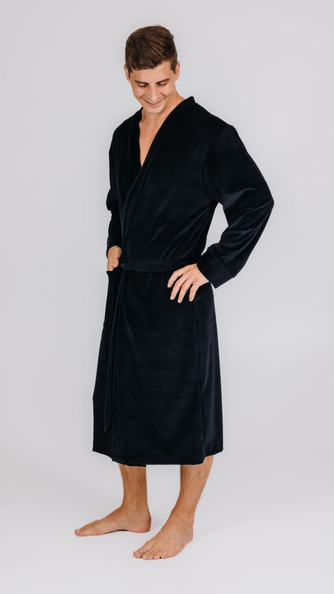 Welurowy szlafrok uszyty z delikatnej, polskiej dzianiny o długości do połowy łydki i z długim rękawem to świetny wybór dla osób, które szukają eleganckiego, a zarazem ciepłego szlafroka.