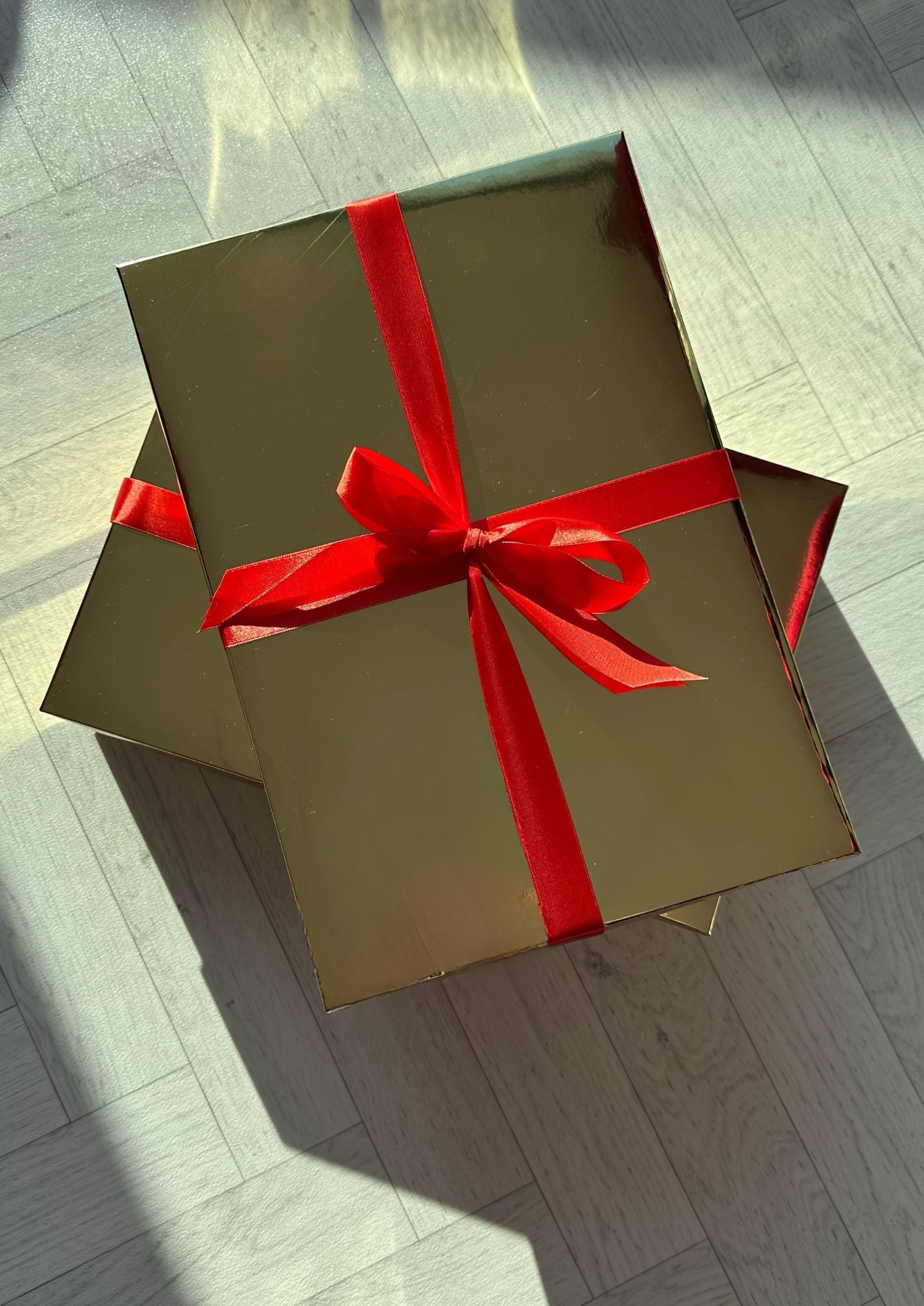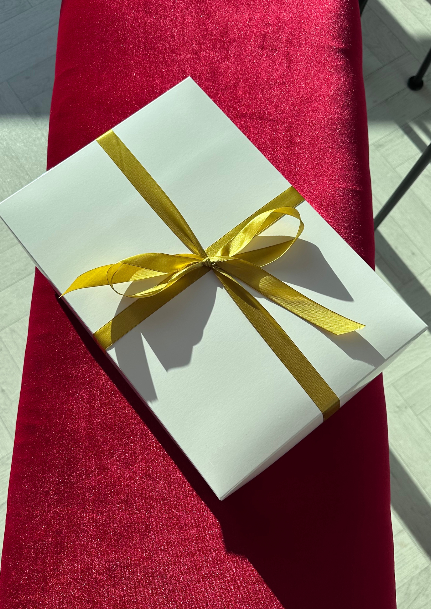 Szlafrok możemy zapakować w eleganckie, złote lub białe laminowane pudełko przewiązane wstążką, dzięki czemu możesz wręczyć go jako gotowy, efektowny prezent.